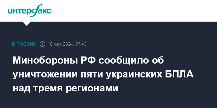 Москва. 10 мая. INTERFAX.RU - Средствами противовоздушной обороны (ПВО) в течение ночи уничтожено пять украинских дронов самолетного типа, один из них сбит в Подмосковье, сообщило Минобороны России в пятницу.