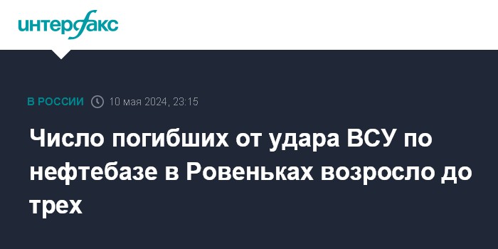 Москва. 10 мая. INTERFAX.RU - Число погибших в результате удара украинской армии по нефтебазе в городе Ровеньки Луганской народной республики (ЛНР) возросло до трех, также до семи возросло количество пострадавших, сообщила министр здравоохранения региона Наталья Пащенко.