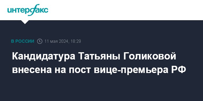 Москва. 11 мая. INTERFAX.RU - Премьер-министр РФ Михаил Мишустин внес на рассмотрение Госдумы кандидатуру Татьяны Голиковой в качестве вице-премьера, отвечающего за деятельность Минздрава, Минтруда и Минкультуры, сообщает пресс-служба правительства.