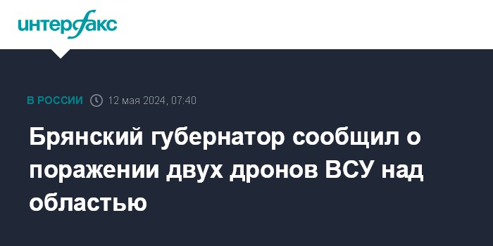 Москва. 12 мая. INTERFAX.RU - Губернатор Брянской области Александр Богомаз сообщил о двух сбитых в регионе в ночь на воскресенье украинских беспилотниках.
