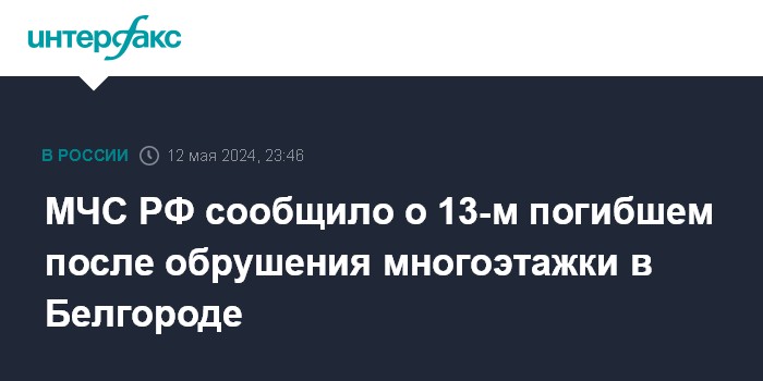 Москва. 12 мая. INTERFAX.RU - Спасатели извлекли из-под завалов частично обрушившейся многоэтажки в Белгороде тело тринадцатого погибшего, заявили в МЧС России в воскресенье.
