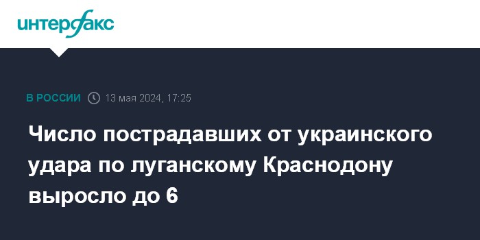Москва. 13 мая. INTERFAX.RU - Количество пострадавших при ударе украинской армии по Краснодону в Луганской народной республике увеличилось до шести, сообщил глава ЛНР Леонид Пасечник.
