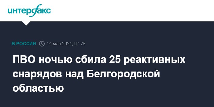 "Дежурными средствами ПВО двадцать пять реактивных снарядов уничтожены над Белгородской областью", - говорится в сообщении Минобороны РФ.
