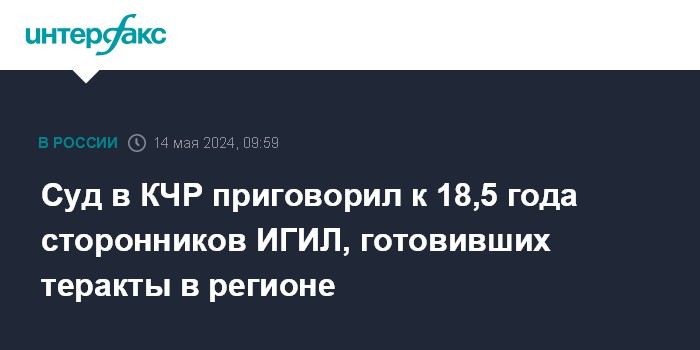 Москва. 14 мая. INTERFAX.RU - Суд в Карачаево-Черкесии назначил 18 с половиной лет колонии трем последователям запрещённой и признанной террористической организации ИГИЛ, которые готовили подрывы административных зданий, сообщил Центр общественных связей (ЦОС) ФСБ.