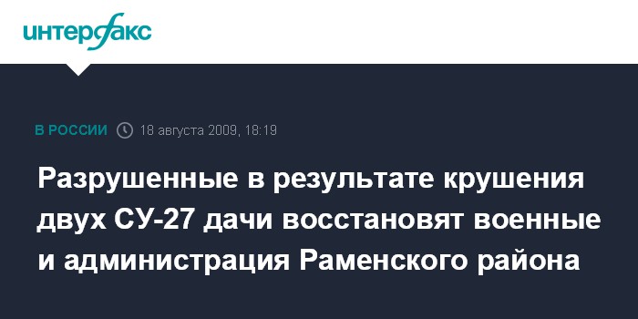 Москва. 18 августа. INTERFAX.RU - Администрация Раменского района и ВВС помогут восстановить домовладения, пострадавшие в результате авиакатастрофы самолетов Су-27, заявил во вторник в эфире радиостанции "Эхо Москвы" председатель садоводческого хозяйства "Сосны" Петр Слонов.