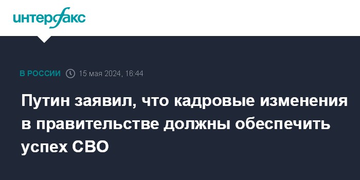 Москва. 15 мая. INTERFAX.RU - Кадровые перемещения должны обеспечить успех в проведении специальной военной операции, заявил президент России Владимир Путин.