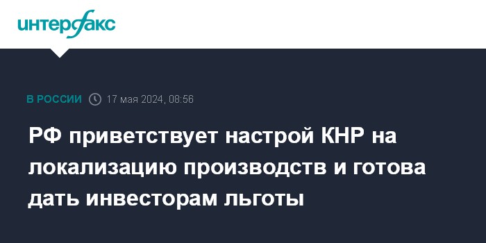 РФ приветствует настрой КНР на локализацию производств и готова дать инвесторам льготы
