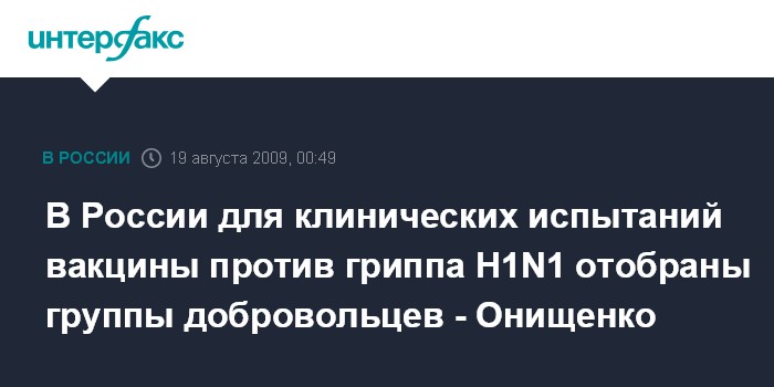 Ранее Г.Онищенко сказал "Интерфаксу", что в зависимости от итогов испытаний вакцины против гриппа H1N1, будет решаться вопрос о том, сколько раз ее будут прививать российским гражданам - однократно или двукратно.