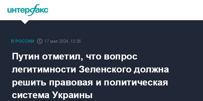 Москва. 17 мая. INTERFAX.RU - Вопрос о легитимности президента Украины Владимира Зеленского после 21 мая должна решить правовая и политическая система этого государства, заявил президент РФ Владимир Путин, отвечая на вопрос, будет ли Россия считать Зеленского после этой даты легитимным главой украинского государства.