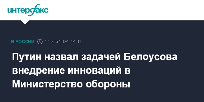Москва. 17 мая. INTERFAX.RU - Недавно назначенный министр обороны России Андрей Белоусов должен будет открыть военное ведомство для инноваций, конструктивной работы с учеными и производителями военной техники, заявил президент РФ Владимир Путин.
