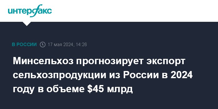 Москва. 17 мая. INTERFAX.RU - Экспорт сельхозпродукции из России в этом году может достичь $45 млрд, говорится в презентации главы Минсельхоза Оксаны Лут, представленной на на пленарной сессии "Технологическое обеспечение продовольственной безопасности" в пятницу на международной выставке-форуме "Россия".