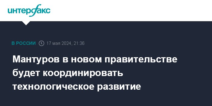 Москва. 17 мая. INTERFAX.RU - Первый вице-премьер Денис Мантуров в новом составе правительства займется общей координацией работы кабмина в области технологического развития. Как сообщила пресс-служба правительства, такое распределение обязанностей между своими заместителями утвердил премьер-министр Михаил Мишустин.