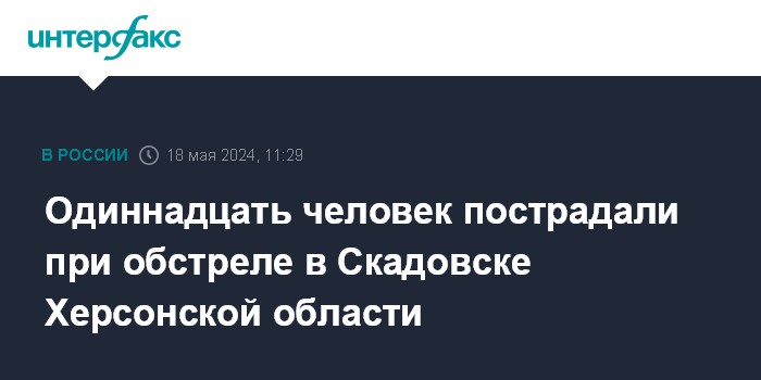 Москва. 18 мая. INTERFAX.RU - ВСУ обстреляли Скадовск (Херсонская область), 11 человек получили ранения, сообщили в субботу журналистам в пресс-службе губернатора региона Владимира Сальдо.