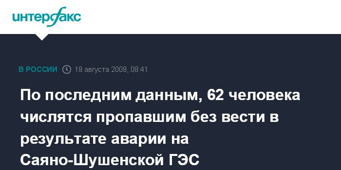 По последним данным, 62 человека числятся пропавшим без вести в результате аварии на Саяно-Шушенской ГЭС