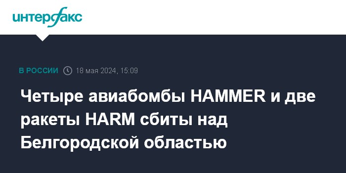 Москва. 18 мая. INTERFAX.RU - Российские военные уничтожили четыре авиабомбы HAMMER французского производства и две ракеты HARM производства США над Белгородской областью, заявили в Минобороны РФ в субботу.