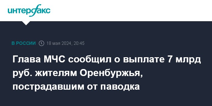 Москва. 18 мая. INTERFAX.RU - Почти 7 млрд рублей выплачено пострадавшим от паводка жителям Оренбургской области, сообщил глава МЧС РФ Александр Куренков на совещании с президентом РФ Владимиром Путиным.