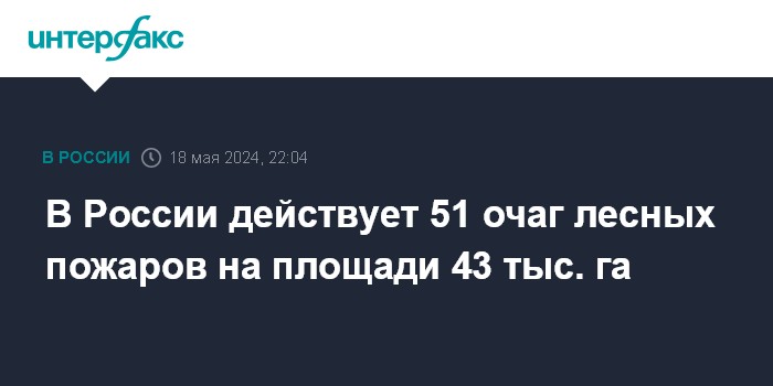 Москва. 18 мая. INTERFAX.RU - В настоящее время на территории РФ действует 51 очаг лесных пожаров на площади 43 тыс. гектаров, сообщил глава МЧС Александр Куренков.