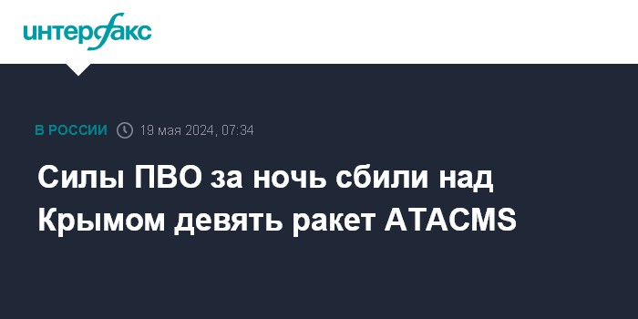 Москва. 19 мая. INTERFAX.RU - Минобороны России заявило, что средства противовоздушной обороны (ПВО) за ночь уничтожили девять американских оперативно-тактических ракет ATACMS и 61 беспилотник ВСУ, из них 57 дронов уничтожено над Кубанью.