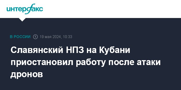 Москва. 19 мая. INTERFAX.RU - "Славянский нефтеперерабатывающий завод" (ООО "Славянск ЭКО") в Краснодарском крае после атаки беспилотников минувшей ночью приостановил работу, сообщил "Интерфаксу" директор по комплексной безопасности группы компаний "Славянск ЭКО" Эдуард Труднев.