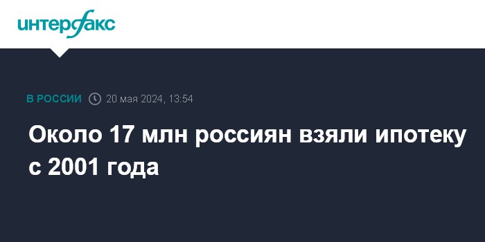 Москва. 20 мая. INTERFAX.RU - Около 17 млн россиян взяли жилищные кредиты с 2001 года, заявил в понедельник генеральный директор ДОМ.РФ Виталий Мутко.