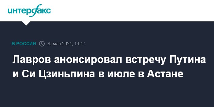 Москва. 20 мая. INTERFAX.RU - Лидеры России и КНР Владимир Путин и Си Цзиньпин встретятся в Астане в июле на "полях" саммита ШОС, заявил глава российского МИД Сергей Лавров в начале встречи с китайским коллегой Ваном И. Министры встречаются в Астане на "полях" СМИД ШОС.