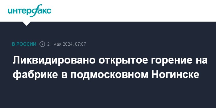 Москва. 21 мая. INTERFAX.RU - Пожарные ликвидировали открытое горение на швейной фабрике в Ногинске Московской области, сообщило МЧС России во вторник.