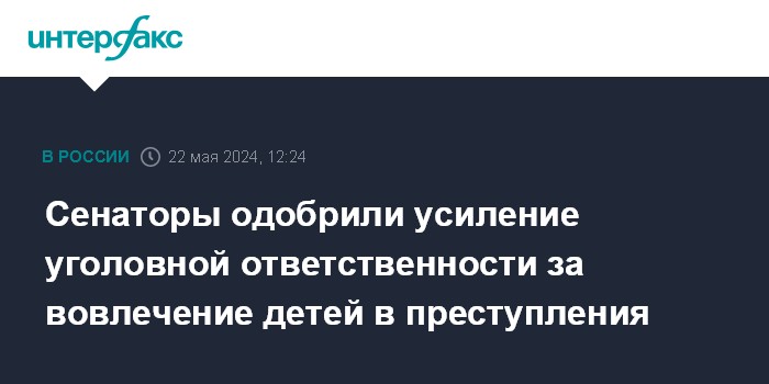Москва. 22 мая. INTERFAX.RU - Совет Федерации одобрил закон об ужесточении уголовного наказания за вовлечение детей в совершение преступлений небольшой и средней тяжести.