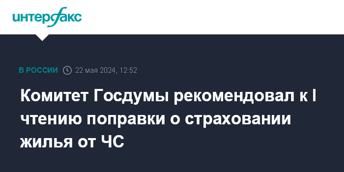Москва. 22 мая. INTERFAX.RU - Комитет Госдумы по финансовому рынку утвердил положительное заключение на законопроект с изменениями, которые должны запустить в России закон о добровольном страховании жилья от ЧС (№320-ФЗ), сообщил "Интерфаксу" источник на страховом рынке.