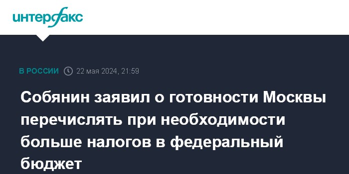 Москва. 22 мая. INTERFAX.RU - Мэр Москвы Сергей Собянин заявил, что столица является одним из главных доноров федерального бюджета и при необходимости готова перечислять больше налогов в бюджет страны.