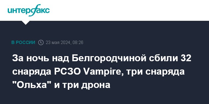 Москва. 23 мая. INTERFAX.RU - Российские военные в течение ночи сбили над Белгородской областью 32 снаряда реактивной системы залпового огня (РСЗО) Vampire, а также три снаряда "Ольха" и три беспилотника, заявили в Минобороны.