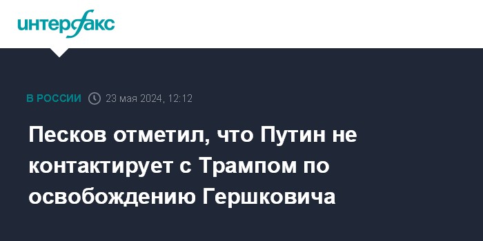 Москва. 23 мая. INTERFAX.RU - Президент РФ Владимир Путин не контактирует с баллотирующимся на пост президента США Дональдом Трампом по вопросу освобождения американского журналиста Эвана Гершковича из российской тюрьмы, заявил пресс-секретарь главы российского государства Дмитрий Песков.