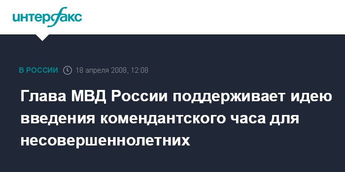 Москва. 18 апреля. INTERFAX.RU - Глава МВД России Рашид Нургалиев считает необходимым ввести ограничения на нахождение несовершеннолетних на улицах в вечернее и ночное время, чтобы сократить преступления в отношении детей.