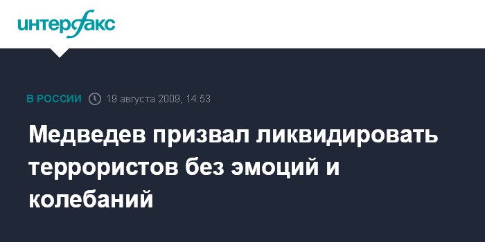 Москва. 19 августа. INTERFAX.RU - С террористами надо бороться не церемонясь, считает президент РФ Дмитрий Медведев. "За те преступления, которые были совершены в последнее время в отношении руководства Ингушетии, отдельных руководителей правоохранительных органов, обычных граждан, правозащитников, за все эти преступления должно последовать весомое неотвратимое наказание", - сказал Медведев, выступая на выездном совещании с участием членов совета безопасности по вопросу "О стабилизации социально-политической обстановки и мерах по нейтрализации террористических и экстремистских угроз в Северо-Кавказком регионе". "С террористами надо продолжать бороться не церемонясь, ликвидируя их без эмоций и колебаний, иначе успеха не добьемся", - подчеркнул президент, обращаясь к участникам совещания.