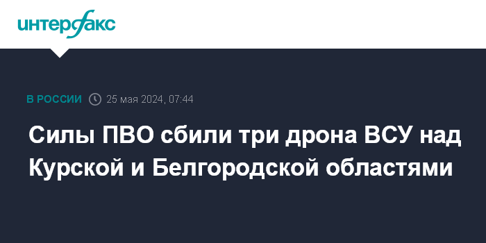 Москва. 25 мая. INTERFAX.RU - Российские военные за минувшую ночь уничтожили три украинских беспилотника самолетного типа над двумя российскими регионами.