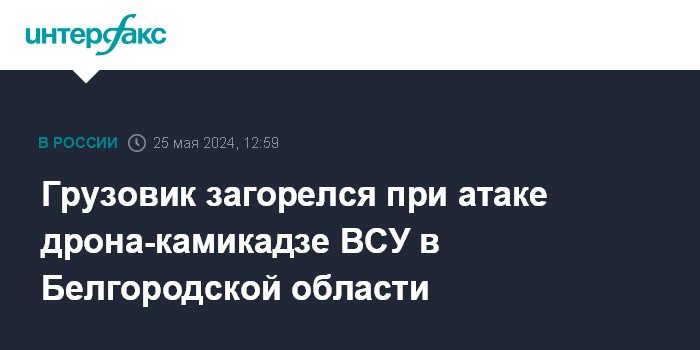 Москва. 25 мая. INTERFAX.RU - Губернатор Белгородской области Вячеслав Гладков сообщил об атаке со стороны Украины дроном-камикадзе, в результате которой загорелся работающий в поле грузовик.