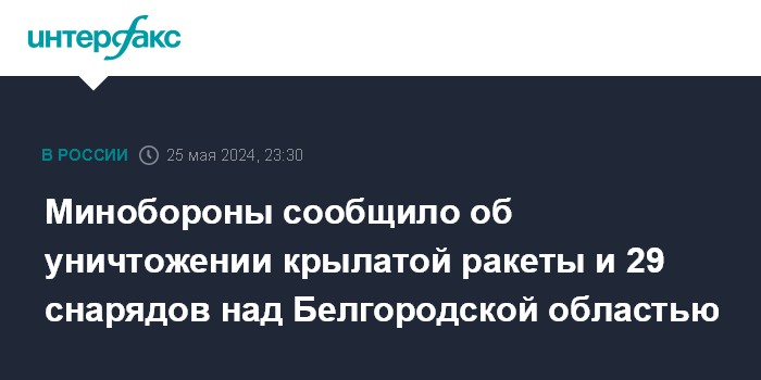 Москва. 25 мая. INTERFAX.RU - Российские военные сообщили, что в субботу около 22:30 по Москве над Белгородской областью уничтожена украинская крылатая ракета и 29 реактивных снарядов.