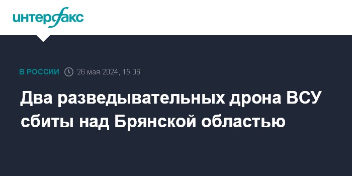 Москва. 26 мая. INTERFAX.RU - Два украинских беспилотника сбиты в Брянской области, сообщил в воскресенье глава региона Александр Богомаз.