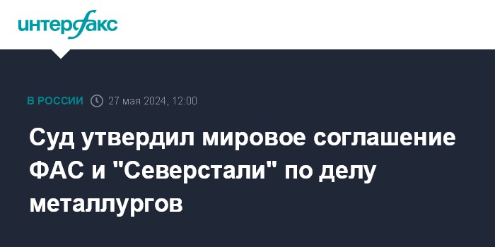 Москва. 27 мая. INTERFAX.RU - Девятый арбитражный апелляционный суд утвердил мировое соглашение по спору "Северстали" и Федеральной антимонопольной службы, говорится в картотеке суда.