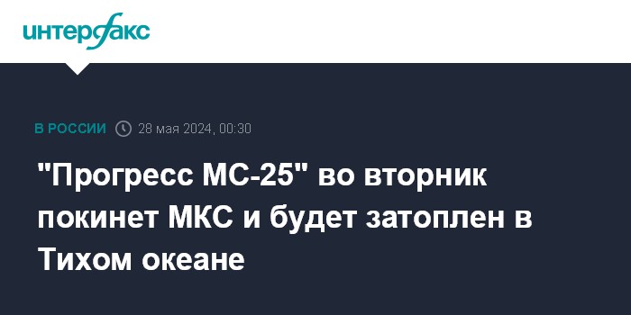 Москва. 28 мая. INTERFAX.RU - Грузовой корабль "Прогресс МС-25" во вторник отстыкуется от Международной космической станции (МКС) для последующего затопления в Тихом океане.