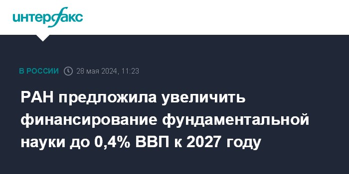 Москва. 28 мая. INTERFAX.RU - Президент Российской академии наук Геннадий Красников выступил за увеличение финансирования фундаментальной науки в России до 0,4% от ВВП к 2027 году.