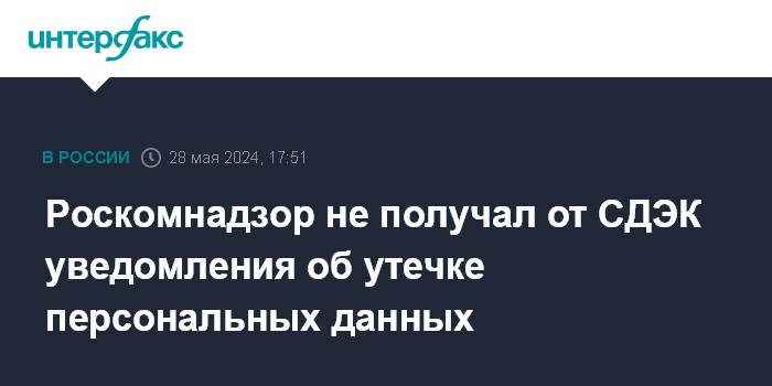 "Согласно закону №152-ФЗ ("О персональных данных" - ИФ) оператор, допустивший утечку персональных данных, обязан в течение 24 часов уведомить об этом Роскомнадзор. По состоянию на 17:00 28 мая 2024 года такие уведомления в ведомство от СДЭК не поступили", - сообщили в ведомстве.