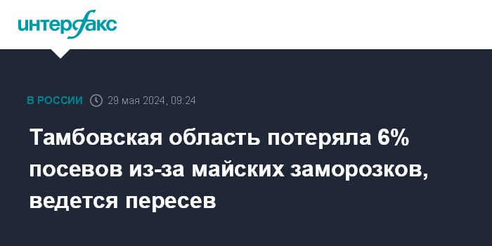 Москва. 29 мая. INTERFAX.RU - Аномальные заморозки в мае привели к гибели сельхозкультур на площади около 110 тыс. га в Тамбовской области, сообщила пресс-служба регионального правительства.