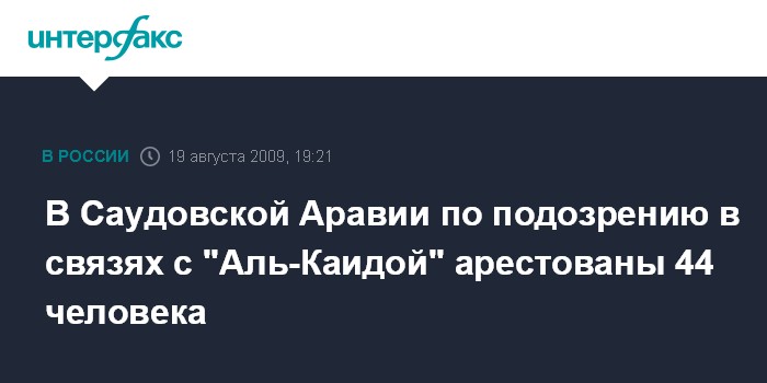Эр-Рияд. 19 августа. INTERFAX.RU - 44 человека, подозреваемые в связях с международной террористической организацией "Аль-Каида", были арестованы в Саудовской Аравии, сообщили в среду местные СМИ со ссылкой на заявление представителя министерства внутренних дел королевства генерала Мансура Турки.