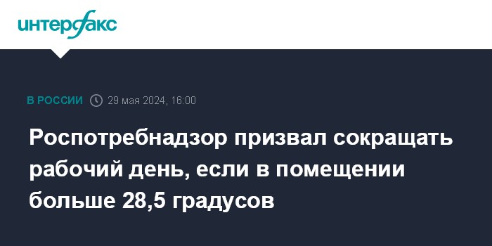 Москва. 29 мая. INTERFAX.RU - Московское управление Роспотребнадзора рекомендует сокращать рабочий день на час, если температура в рабочем помещении без кондиционера достигает 28,5 градусов, сообщается на сайте ведомства.
