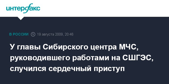 Саяно-Шушенская ГЭС. 19 августа. INTERFAX.RU - Начальника Сибирского регионального центра МЧС генерал-майора Данияра Сафиулина, руководившего работами по ликвидации аварии на Саяно-Шушенской ГЭС в первые дни, везут в Москву с сердечным приступом, сообщил журналистам источник в Федеральном медико-биологическом агентстве (ФМБА).