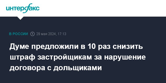 Думе предложили в 10 раз снизить штраф застройщикам за нарушение договора с дольщиками