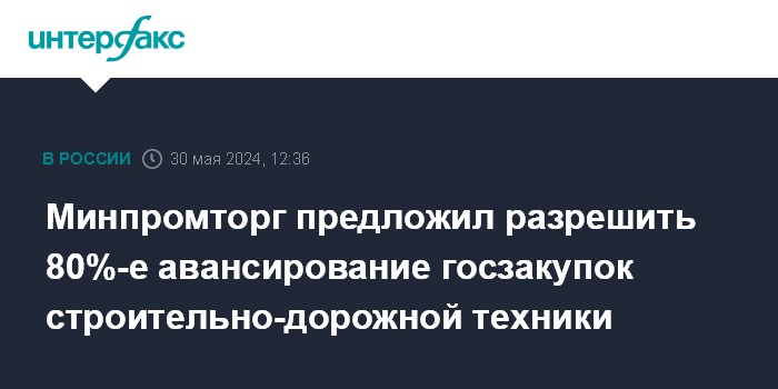 Москва. 30 мая. INTERFAX.RU - Система авансирования не менее 80% стоимости госконтрактов, действующая сейчас при закупке российской станкоинструментальной продукции, может быть распространена на госзакупки строительно-дорожной техники. Проект такого постановления опубликовал на regulation.gov.ru Минпромторг.