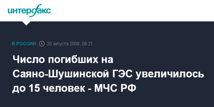 Саяно-Шушинская ГЭС. 20 августа. ИНТЕРФАКС - Около 5:40 утра МСК найдено еще одно тело погибшего на Саяано-Шушинской ГЭС, сообщил главе МЧС РФ Сергею Шойгу в ходе брифинга директор департамента гражданской защиты МЧС РФ Сергей Шапошников.
