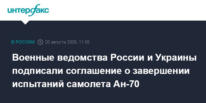 Военные ведомства России и Украины подписали соглашение о завершении испытаний самолета Ан-70