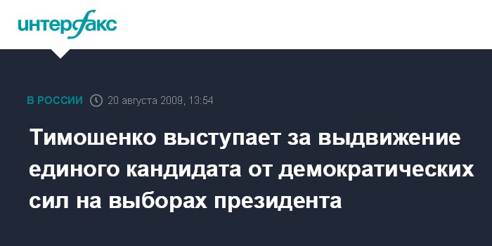 Москва. 20 августа. INTERFAX.RU - Лидер блока БЮТ, премьер-министр Украины Юлия Тимошенко выступила за объединение национальных демократических сил и выдвижение единого кандидата от них на предстоящих выборах президента.